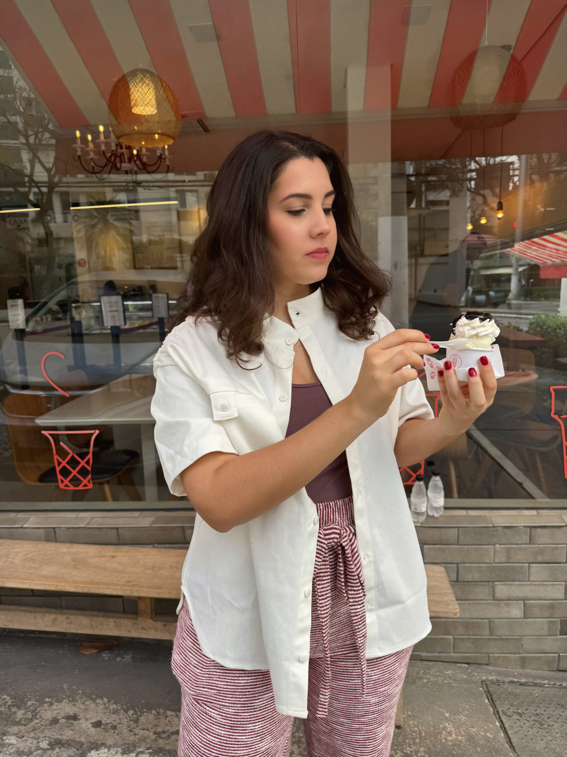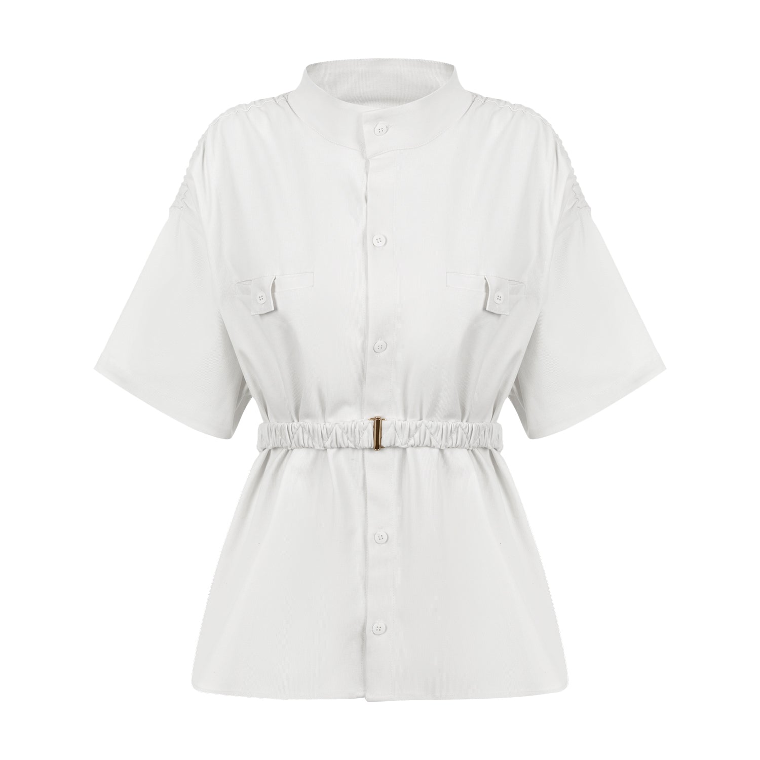 Camisa de manga curta com modelagem ampla e gola padre. Possui bolsos frontais invisíveis e detalhes em elásticos nas costas e ombros que já são assinatura da Verde - garantem um caimento feminino e moderno.